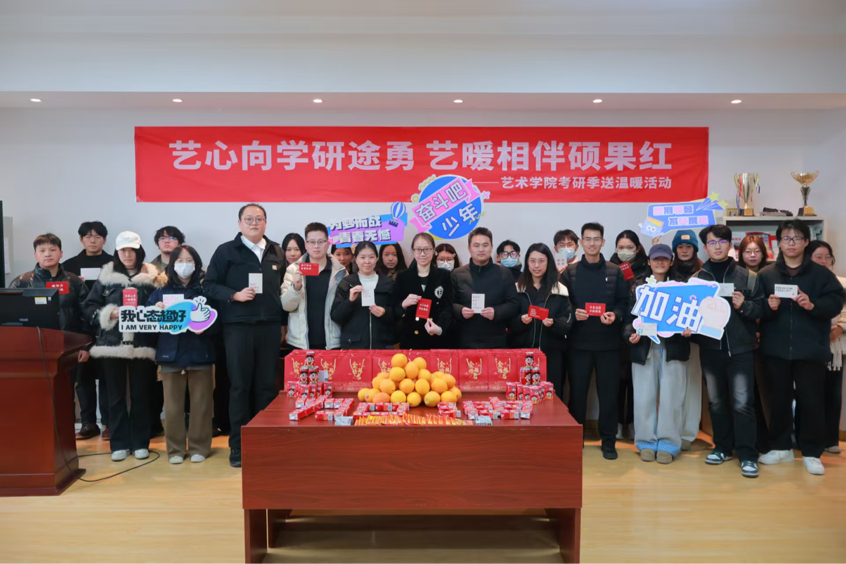 于213会议室举办“艺心向学研途勇 艺暖相伴硕果红”考研送温暖活动。学院党委副书记兼副院长丁一宁与全体辅导员老师出席活动,为即将踏上考研战场的学生送上真挚关怀与美好祝福。