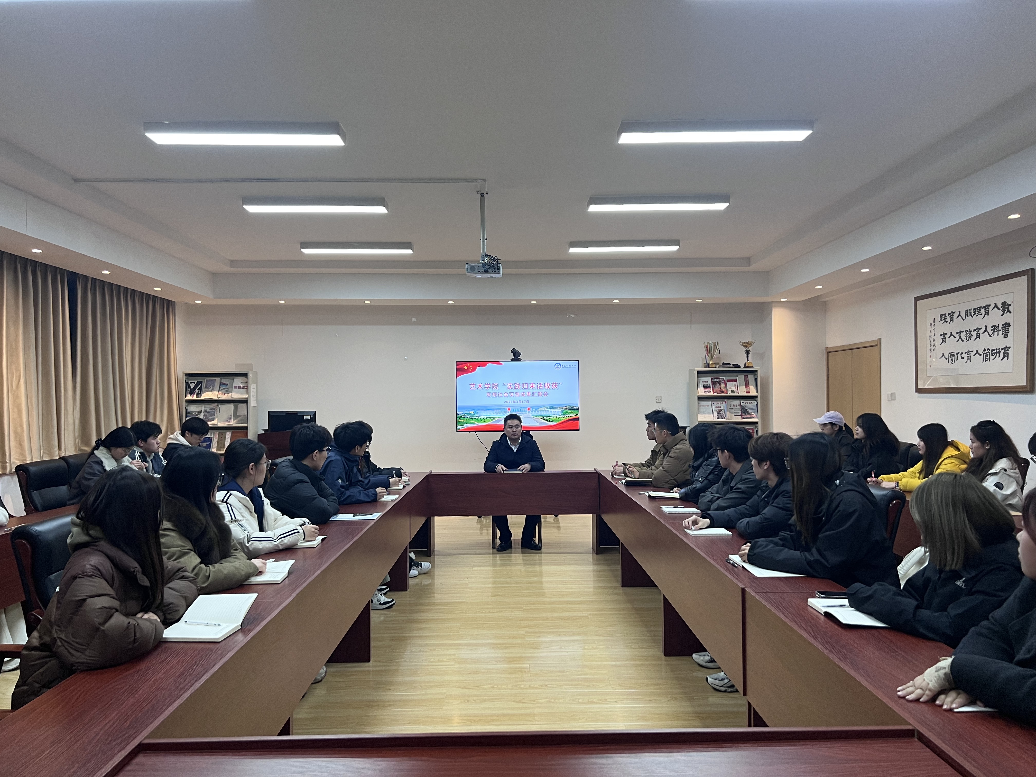 会上,颜枫对2026年寒假社会实践整体开展情况作全面总结。寒假期间,学院紧扣艺术专业特色,聚焦“返家乡”社会实践、文化传承、美育服务、乡村振兴、社区志愿服务等方向,组织艺院学子以个人实践与团队组队相结合的形式,奔赴各地开展实践活动。同学们发挥美术、设计、音乐等专业优势,走进社区乡村写福送春联、开展美育课堂、参与非遗民俗展演、助力乡村文创设计与品牌提升,同时积极投身基层治理、公益服务与文化宣传,用艺术服务社会、用行动诠释担当,形成一批有温度、有特色、有影响的实践成果。